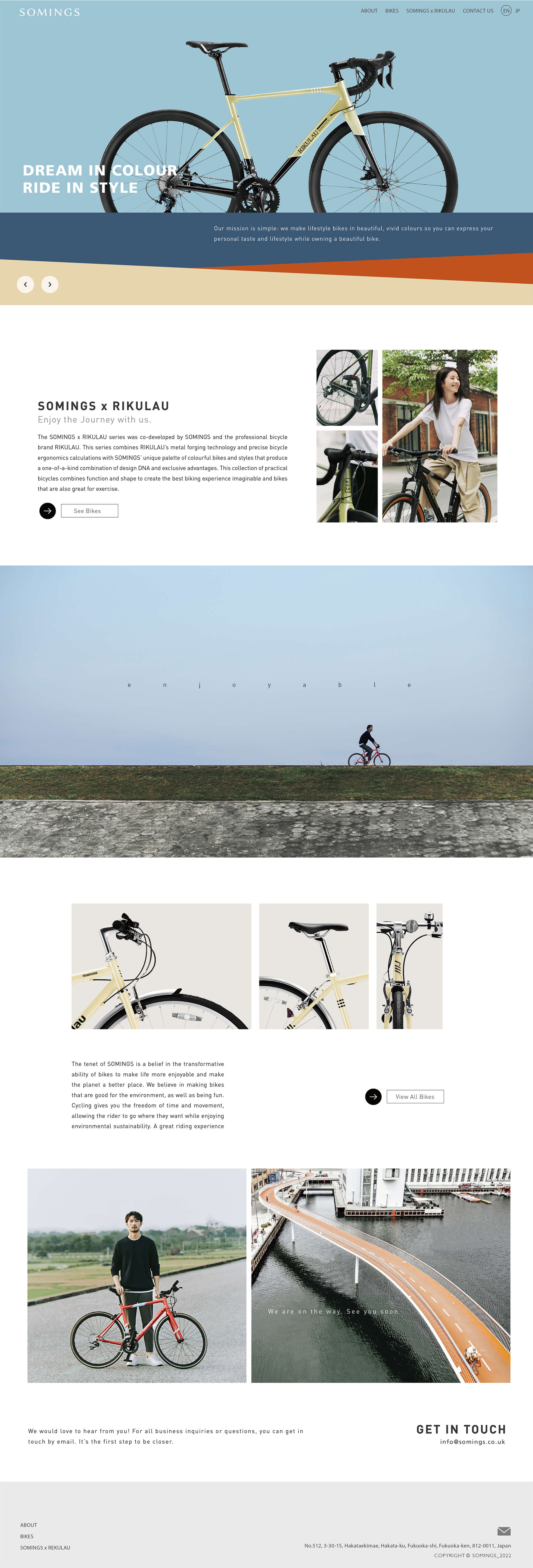 SOMINGS 總部位於日本福岡的SOMINGS,是以重視綠能環保與強調生活風格為主的自行車品牌,我執行此 品牌整體設計以及車體色彩規劃,並負責與專業自行車品牌Rikulau合作系列車款的車體設計,同時 擔任SOMINGS的品牌視覺顧問,負責品牌的視覺控制