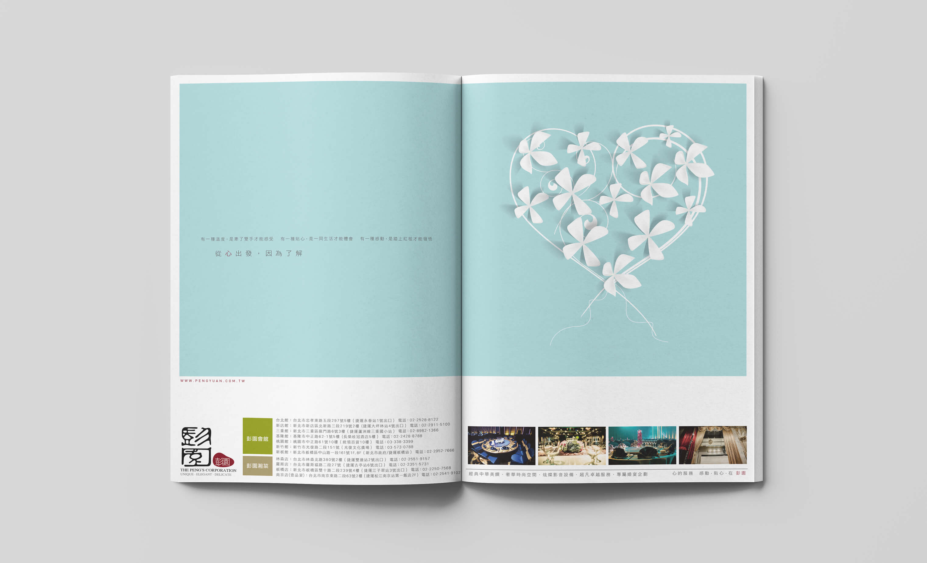彭園餐飲集團 此客戶彭園餐飲集團,旗下以彭園湘菜館和彭園婚宴會館兩個系統為主,負責此品牌湘菜餐飲和婚宴會館 的整體視覺執行和相關控管,包含VI、宣傳製作物、市視覺、雜誌廣告、展場空間視覺呈現等。