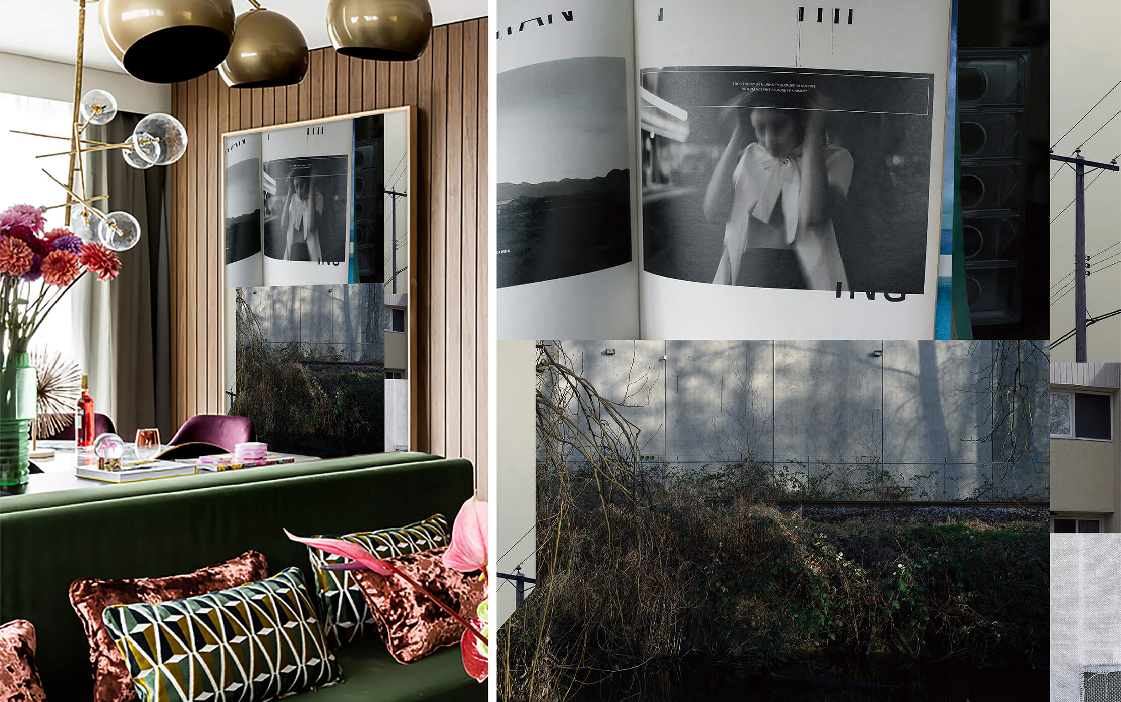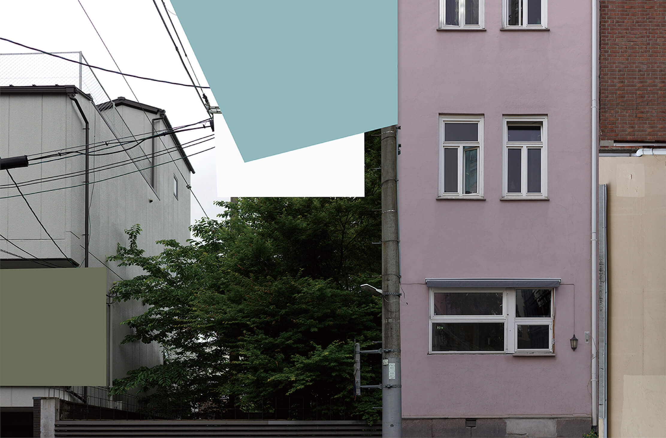 A lush tree stands alongside a minimalist building, while original imagery, geometric forms, and solid color blocks