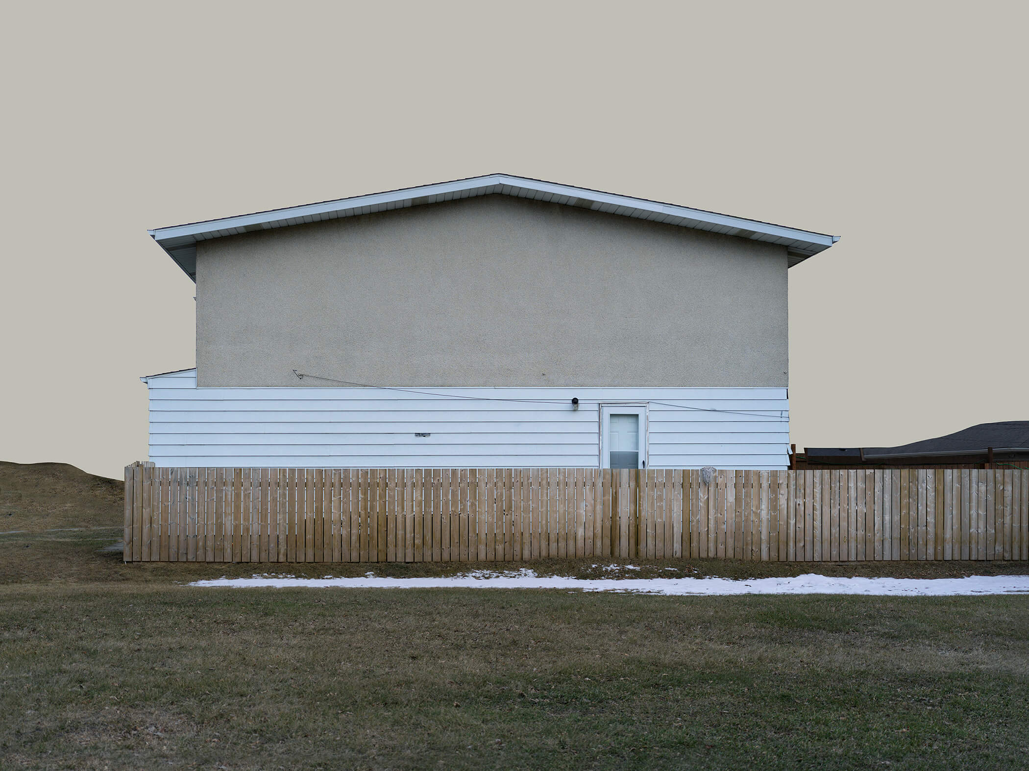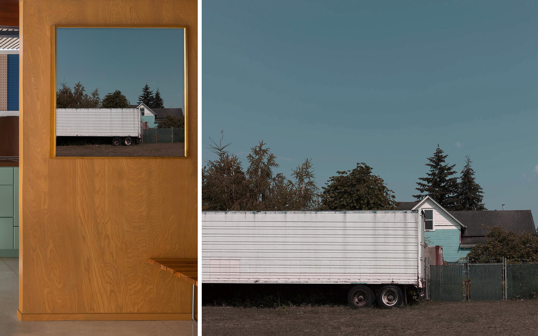 This work partially conceals a house with an abandoned trailer, creating a distinct visual rhythm within the